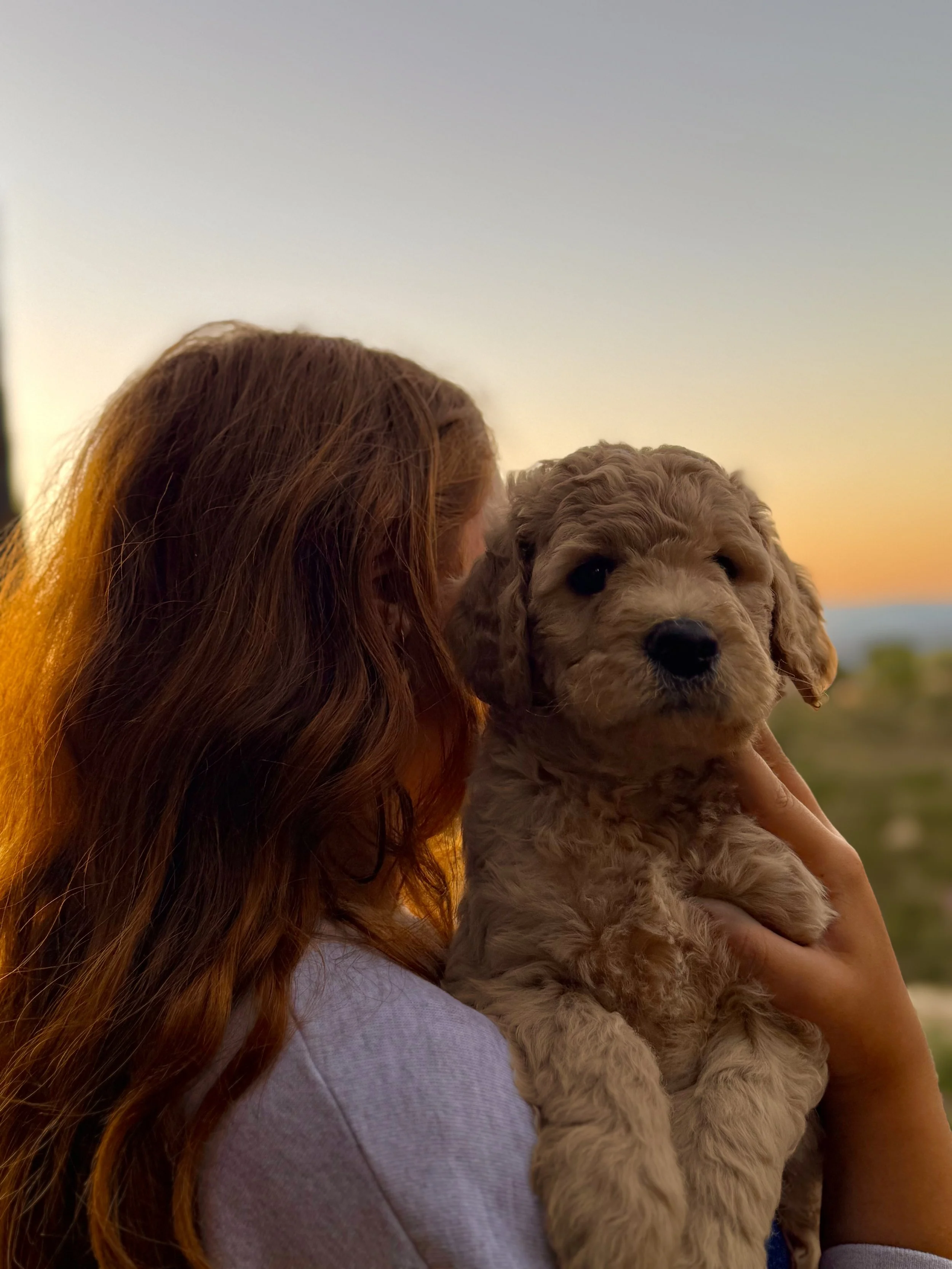 The largest pup in the litter, Virgie is the lightest pup who is all belly and adventurous. He’s likely to grow into a larger Goldendoodle, as he carries himself with the kind of laid-back confidence that makes for a perfect companion.